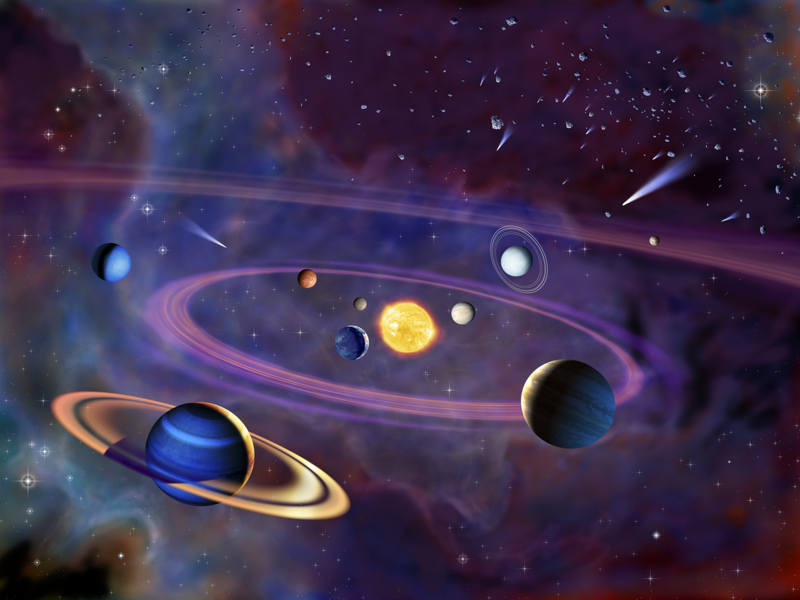 Farbenfrohe, surreale Darstellung unseres Sonnensystems.