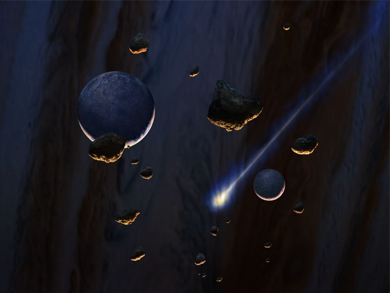 Die dunkle Nachtseite eines Gasriesen ist zu sehen. Zwei eisige Monde und einige Asteroiden sind in seinem Schwerkraftfeld gefangen. Ein Asteroid verglüht in der oberen Hochatmosphäre des Gasriesen.